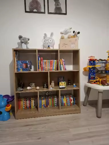 La répartition des cases permet d’exposer et de ranger sans surcharger la pièce. Son look bois travaillé apporte une touche chaleureuse qui s’intègre au salon, à la chambre comme au bureau.