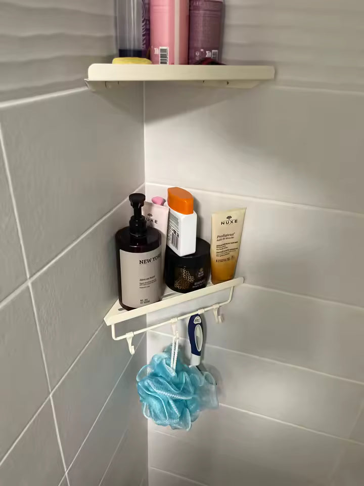 Le plateau ajouré évacue l’eau pour aider à garder vos produits au sec, tout en offrant une visibilité immédiate. Son format triangulaire exploite l’espace vertical et se glisse facilement dans la plupart des cabines.